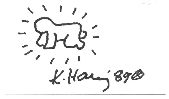HARING, Keith (1958-Feb. 16, 1990). American artist whose art and graffiti work grew out of New York City. He became extremely popular during the 1980’s. He died of aids-related complications. Original very popular sketch on a 3”x5” card of a “crawling baby. ”Signed “K. Haring ,89.” This was received through the mail on Thursday, December 14, 1989 just 62 days before his passing, His sketch and signature start to show the effects of his illness. A wonderful example...SOLD