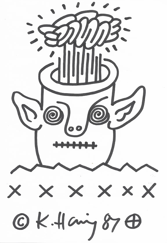 HARING, Keith (1958-1990) American graffiti artist of the 80’s. Diagnosed with Aids in 1988. Unusual large original sketch, using a wide black Sharpie pen, measures 8”x11.5” of a man with the top of his head exploding and his brain coming out. Boldly signed and dated “K. Haring 87.” Ample margins for framing and in MINT condition....................SOLD![]() |