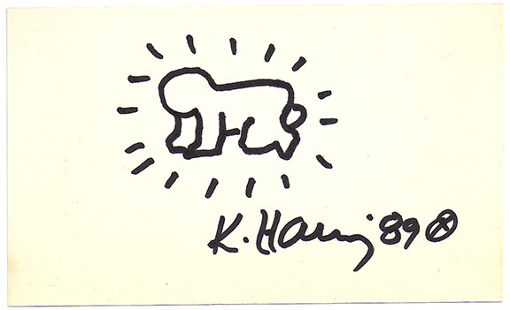 HARING, Keith (1958-1990). Noted American artist and social activist whose became a sensation in the art world internationally with his cartoon and graffiti influenced works. His work responded to New York Street culture of the 1980’s. Died at a very young age making his genuine autographs very difficult to acquire. Original sketch of his famous “Radiant Baby” signed and dated “89” on a 3”x5” card. Note on verso states this was drawn in New York City on November 14, 1989. Very scarce, this is only the third sketch we have handled by Haring. In fine condition...... SOLD