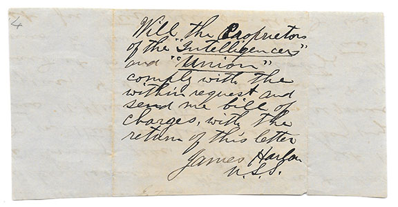 (1820-1899) U.S. Senator from Iowa (1853-1865). Supporter of Abraham Lincoln. Robert Lincoln married Harlan’s daughter. Harlan was appointed Secretary of the Interior and he also served one year under President Johnson. Harlan rode the Lincoln funeral train to Springfield. Autograph note signed in full: “Will the proprietors of the ‘Intelligencer’ and ‘Union’ comply with the within request and send me bill of charges with the return of this letter. James Harlan U.S.S.” In fine condition...............