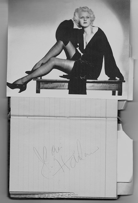 HARLOW, Jean (1911-1937). American actress who portrayed a bad girl character. She was the leading sex symbol of the early 30’s. On July 2,1932 she married Paul Bern who committed suicide on Sept. 5, 1932, two months later. Leather album, ‘Travel Notes” with the original pencil attached which the actors/personalities used to sign their names. A few who signed are: Mrs. Gertrude Temple, Shirleys Mother, Cecilia Parker, Fred Stone, Paula Stone, Jean Harlow and a few others. Most likely these persons were on a cruise. Genuine signatures of Jean Harlow are quite uncommon. SOLD