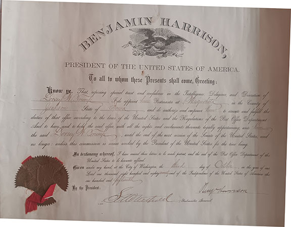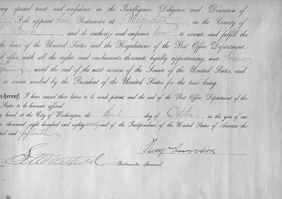 HARRISON, Benjamin (1833-1901). The 23rd President of the United States (1889-1893). Grandson of William H. Harrison and the last Civil War General to serve as the U.S. President. Benjamin Harrison died just six months before McKinley’s assassination. Partly printed document signed, appointing Dorsey W. Trump Postmaster of Maquoketa, Iowa a Postmaster, dated October 3, 1890. Bold signature of Harrison and countersigned by the Acting Postmaster General. More than half the seal and ribbons attached otherwise in very good condition....$975.00