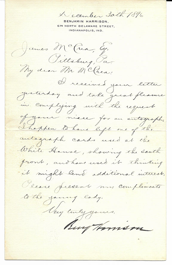 HARRISON, Benjamin (1833-1901). The 23rd President of the United States (1889-1893). Grandson of William H. Harrison and the last Civil War General to serve as the U.S. President. Benjamin Harrison died just six months before McKinley’s assassination. Letter signed on his imprinted name and address stationery. December 30, 1896, To James McCrea, “I received your letter yesterday and take great pleasure in complying with the request of your niece for an autograph. I happen to have left one of the autograph cards used at the White House, showing the south front, and have used it thinking it might lend additional interest. Please present my compliments to the young lady. Very truly yours, Benjamin Harrison.” Choice bold ink signature of Benjamin Harrison. Very fine condition..........................$775.00