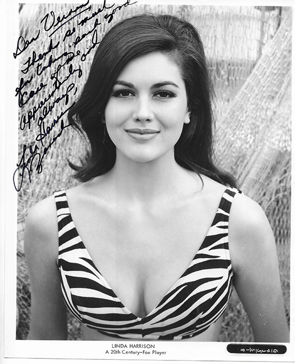 HARRISON, Linda (1945- ) American actress, appeared as “Nova” in the science fiction film Beneath the Planet of the Apes, also in Batman and Wonder Woman. Married to Richard D. Zanuck. Attractive photograph, 8”x10” a 20th Century Fox portrait of Harrison wearing a tiger print bikini top, bust pose smiling. Inscribed: “Dear Vernon, Thanks so much for taking such good care of me. Appreciatively and always, Linda Harrison Zanuck.”.........$85.00