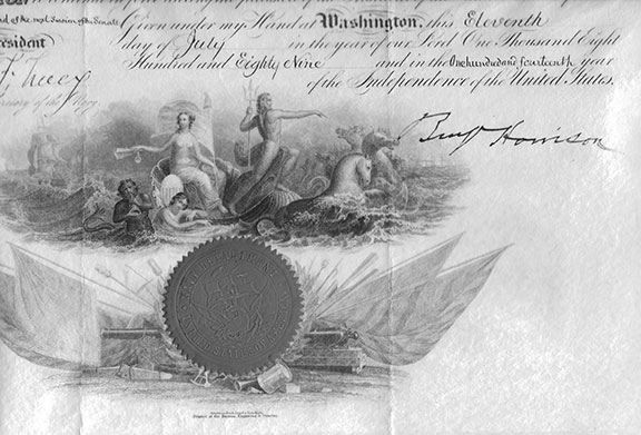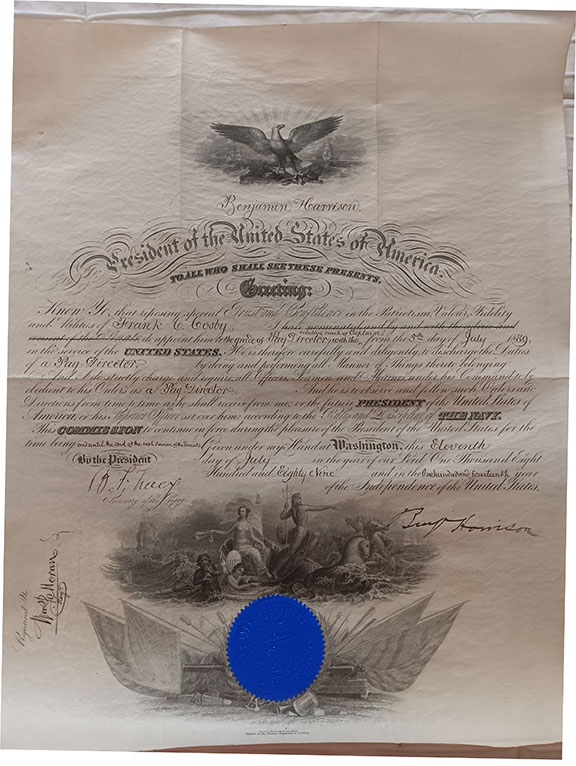 HARRISON, Benjamin (1833-1901). The 23rd President of the United States (1889-1893). Grandson of William H. Harrison and the last Civil War General to serve as the U.S. President. Benjamin Harrison died just six months before McKinley’s assassination. Wonderful document, as President, on vellum, appointing Frank C. Cosby, Pay Director according to the Rules and Discipline of the Navy. Dated July 11,1889. The signature of Harrison rates a “10.” Countersigned by the Secretary of the Navy, B. F.Tracy. Blue seal completely intact. A very attractive document.....................$1250.00