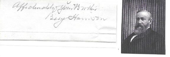 HARRISON, Benjamin (1883-1901). Twenty third President of the United States (1889-1893) Wonderful three words and signature in pencil by his hand: “Your affectionate brother Benj Harrison.” A very early item cut from an autograph letter signed. On a slip 1.5”x4”. In excellent condition...........$250.00 |