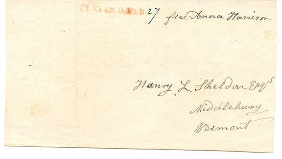 HARRISON, Anna (1775-1864). First Lady of the United States during her husband’s one month term in 1841. She was the oldest lady to become a first lady. She was also the first person to be widowed while holding the title. Front panel of an envelope, hand addressed by Anna Harrison to Henry L. Sheldon Esq. Middlebury Vermont. Top right corner she has written “Free Anna Harrison.” Postal marking “Cleves, O. Feb,27.” In very fine condition and rather scarce. Cleve’s Ohio was a small town founded and named by Judge Cleves Symmes, the father of Anna Harrison...........SOLD