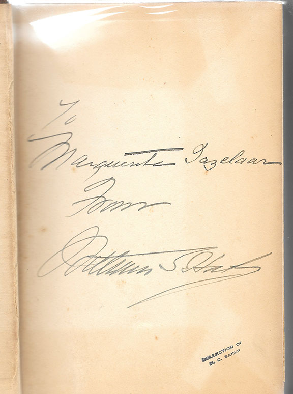 HART, William S. (1872-1946), American stage and screen actor. His book: My Life East and West. Boston, Houghton Mifflin Co. 1929, First Edition. Three hundred sixty-three pages photographs, frontispiece portrait of Hart in color on horseback by Charles M. Russell. Inscribed and signed: “To Marguerate Tazelaar from William S. Hart.” Small tear top of spine, slight wear bottom of spine and both bottom corners otherwise a very good copy. Hart spent his boyhood in the Dakota prairies. While still a boy he became a ranchman, hunter and bullwhacker. He went east and eventually became an actor. His stage life is a chapter out of the heart of American theater history. He reflects on his contacts with almost all the better-known actors of the stage of the time. When the movies came, Hart saw and seized his opportunity and went to Hollywood. The authenticity and skill he brought to the Western pictures revolutionized the making of the cowboy scenes. Soundly trained as an actor, with all the knowledge of his plains youth to draw upon, the parts he played were the real thing. This book also contains some interesting material on Wild Bill Hickok, Bat Masterson and Wyatt Earp. Not a common signed book of the autobiography of the famous cowboy actor............$375.00