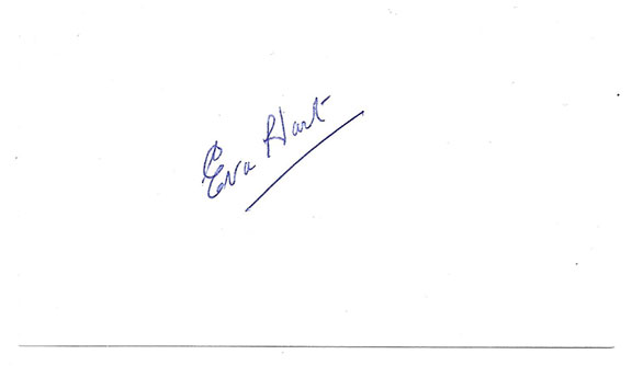 HART, Eva (1905-1996). One of the most outspoken survivors of the Titanic disaster. She criticized the White Star Line for failing to provide sufficient life boats for the passengers. She died on April 14, 1996. Choice ink signature well centered on a 3”x5” card....................$95.00![]() |