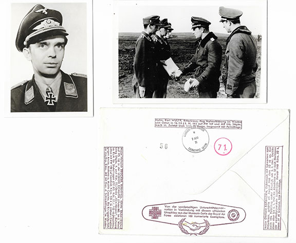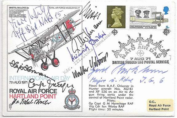 HARTMANN, Erich, Gerhard Barkhorn, Walter Schuck, Wolfgang Spate, Diethlem Von Eichel-Streiber, Ernst Scheufele, Hajo Hermann, Karl Wulff and Heinrich Bruckner. English Nato Air Day Cover, 7 Aug, 1971, flown by the R.A.F. hand signed by the Germans listed above. Envelope contains seven B&W photographs of most of the signers. Very uncommon to find the highest and second highest aces in the world on the same item. Also, not too common is Barkhorn signed with his full signature. A magnificent piece...................$495.00