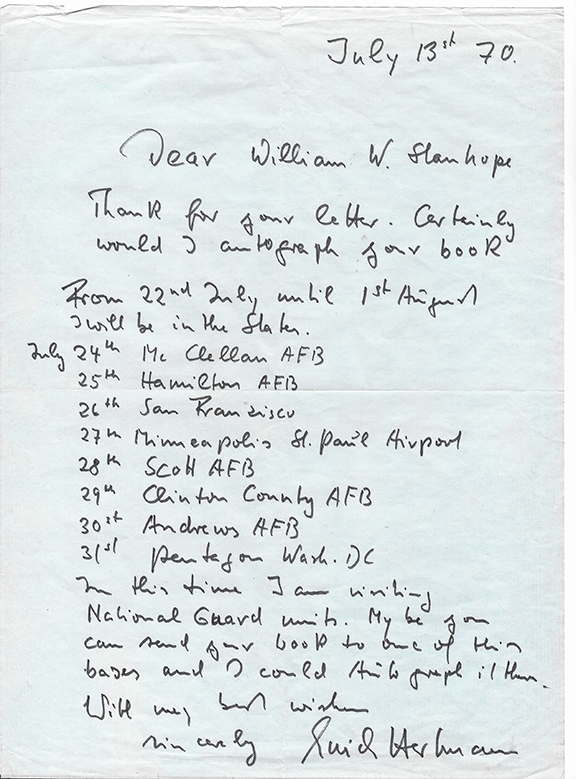 Total 653 Victories HARTMANN, Eric (1922-1993). German fighter pilot, world’s top scoring Ace credited with 352 victories. Called “The Black Devil” by the Soviets. Uncommon autograph letter signed, one vey full page, 8.5”x11” July 13th 70 to William W. Stanhope (a major collector of autographs of the Aces). Hartmann thanks Stanhope for his letter and agrees to autograph a book. Hartmann continues to write his schedule for July up to August listing all the Air Force bases he will be attending. Harmann signs this letter with his full signature. A very light fold at the top of the letter not touching any writing.........$495.00
