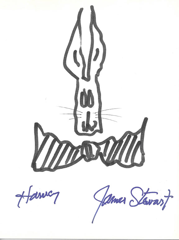 He appeared in 80 films from 1935-1991. One of his most noted films was Harvey (1950). A story about befriending an invisible rabbit. How Stewart imagined the rabbit is what he drew in this oversized sketch of Harvey. This hand drawn sketch is accomplished using a bold black felt tip pen on an 8.5”x11” card stock. In addition, Stewart has boldly signed his name in full, at the bottom right-hand corner. He has added the name Harvey in the bottom left-hand corner. In near fine condition. At one time, the autograph market was flooded with these type sketches and about 80%, maybe more of those sold are considered not genuine....$450.00