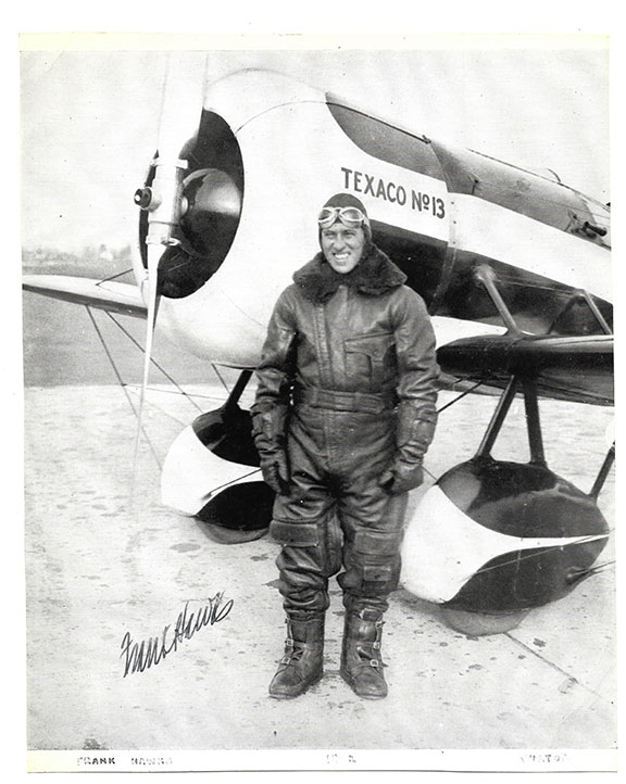 HAWKS, Frank (1897-1938). Famous American speed pilot. He set several records during his short life. In June 1929 he established a round trip transcontinental flight record from New York to Los Angeles and return. He completed the first transcontinental glider flight in 1930. He died in a plane crash in New York while only 40 years old. Photograph, 8”x10”, B&W full length pose of Hawks dressed in his flight gear in 1932. He is standing in front of his Texaco plane. Boldly signed with excellent contrast. Very uncommon in this size photograph. He died only six years later.................$275.00