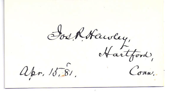HAWLEY, Joseph R. (1826-1905). Brig. General of Volunteers. Led divisions of the 10th & 24th Corps in So. Carolina and Florida. Choice signature on a card dated April 15,81 at Hartford, Conn......................... $55.00