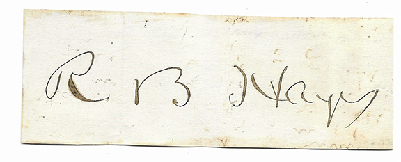 HAYES, R. B. (1822-1893) Rutherford B. Hayes had been commissioned Major in the 23rd Regiment Ohio Volunteer Infantry in 1861, attaining the rank of Major General of Volunteers. He saw action at South Mountain (where he was wounded in 1862), the second Battle of Winchester, Fisher's Hill, and Cedar Creek, where he was badly stunned when his horse was killed. Hayes later served as Republican Congressman from Ohio (1865-1867) and Governor of Ohio (1868-1872, 1876-1877) before being elected 19th U.S. President (1877-1881). A very scarce, early signature (R.B. Hayes) seldom seen on heavy paper 1.25”x3.5”.................$325.00