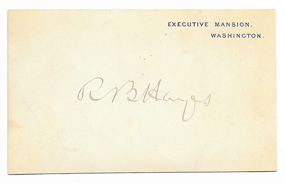 HAYES, R. B. (1822-1893) Rutherford B. Hayes had been commissioned Major in the 23rd Regiment Ohio Volunteer Infantry in 1861, attaining the rank of Major General of Volunteers. He saw action at South Mountain (where he was wounded in 1862), the second Battle of Winchester, Fisher's Hill, and Cedar Creek, where he was badly stunned when his horse was killed. Hayes later served as Republican Congressman from Ohio (1865-1867) and Governor of Ohio (1868-1872, 1876-1877) before being elected 19th U.S. President (1877-1881). A very desirable Executive Mansion card signed. When starting a collection of these cards, Hayes is the very first you will be able to acquire. They are much in demand and slowly loosing availability in the autograph hobby. There is only one known Grant Executive Mansion “signed” to appear in the market. Theodore Roosevelt changed the name of Executive Mansion to “White House” and shortly after to “The White House.” This Hayes card has some mounting traces on the verso otherwise in very good condition.................SOLD