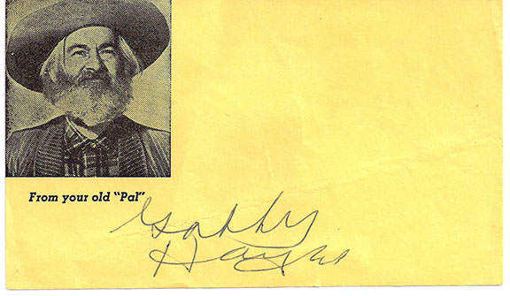HAYES, Gabby (1885-1969). Comic actor, sidekick to Hopalong Cassidy and Roy Rogers. A very uncommon genuine signature on a slip with his printed portrait and the printed statement: “From your old Pal”. Excellent.............................. $185.00 |