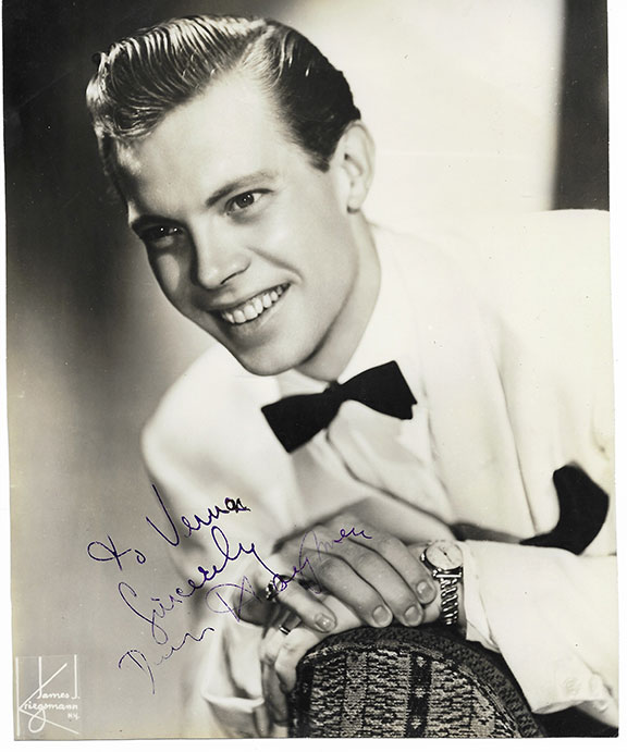 HAYMEN, Dick (September 13, 1918 – March 28, 1980) was an Argentinean-born actor and singer, active in the United States. He was one of the most popular male vocalists of the 1940s and early 1950s. He was the older brother of Bob Haymes who was an actor, television host, and songwriter. At the age of 17, Haymes moved to Los Angeles where he initially worked as a stunt man and film double. At the age of 19, he moved to New York City where he worked as a vocalist in a number of big bands. On September 3, 1942, Frank Sinatra introduced Haymes on radio as Sinatra's replacement in the Tommy Dorsey band. Prior to joining Dorsey's group, Haymes sang with the Harry James Orchestra. In 1945 Haymes co-starred with Jeanne Crain, Dana Andrews and Vivian Blaine in the musical State Fair. He teamed with female vocalist Helen Forrest for many hit duets during World War II, including "Together," "I'll Buy That Dream," and "Long Ago and Far Away." He sang with Judy Garland on two Decca recordings of songs from the film “The Shocking Miss Pilgrim”, in which he appeared with Betty Grable. From 1944 to 1948, he had his own radio program, The Dick Haymes Show, first on NBC and later on CBS. He paired repeatedly with the Andrews Sisters (Patty, Maxene, and LaVerne) on a dozen or so Decca collaborations, including the Billboard hit "Teresa," "Great Day," "My Sin," and a 1952 rendering of the dramatic ballad "Here in My Heart," backed by the sisters and Nelson Riddle's lush strings. His duets with Patty Andrews were also well received, both on Decca vinyl and on radio's Club Fifteen with the sisters, which he hosted in 1949 and 1950. He also joined Bing Crosby and The Andrews Sisters for 1947 session that produced the Billboard hit "There's No Business-Like Show Business," as well as "Anything You Can Do (I Can Do Better)." His popular renditions of tender ballads such as "Little White Lies" and "Maybe It’s Because" were recorded with celebrated arranger Gordon Jenkins and his orchestra and chorus. World War II Hayme’s birth in Argentina to non-U.S. citizens meant he was not an American citizen. In order to avoid military service during World War II, Haymes asserted his nonbelligerent status as a citizen of Argentina, which was neutral at that time. Hollywood-based columnists Louella Parsons and Hedda Hopper questioned Hayme's; patriotism, but the story had little effect on his career. About that time, he was classified 4-F by the draft board because of hypertension. As part of his draft examination, he was confined for a short period to a hospital on Ellis Island, which confirmed his hypertension. In 1953, Haymes went to Hawaii (then a territory and, technically, not part of the United States) without first notifying immigration authorities. On returning to the mainland United States, he was nearly deported to Argentina, but won his battle to remain in the United States. Haymes was married six times, including to film actresses Joanne Dru (1941-1949), Rita Hayworth (1953 -1955), and Fran Jeffries (1958 - 1964). He was also married to Nora Eddington (1949 - 1953), a former wife of Errol Flynn. Hayes had a total of six children-three with Joanne Dru, one with Fran Jeffries, and two with his sixth and final wife, British model Wendy Smith. Death On March 28, 1980, Haymes died from lung cancer in at Cedars-Sinai Medical Center in Los Angeles. He was 61 years old. Mutiny on the Bounty (1935) - Able-Bodied Seaman (uncredited) Dramatic School (1938) - Student (uncredited) Du Barry Was a Lady (1943) - Singer (uncredited) Girl Crazy (1943) - Member, The Pied Pipers (uncredited) Four Jills in a Jeep (1944) - Lt. Dick Ryan Irish Eyes Are Smiling (1944) - Ernest R. Ball I Am an American (1944)[12] - Himself (uncredited) Diamond Horseshoe (1945) - Joe Davis Jr. State Fair (1945) - Wayne Frake Fallen Angel (1945) - Himself - JukeBox Vocalist (voice, uncredited) Do You Love Me (1946) - Jimmy Hale The Shocking Miss Pilgrim (1947) - John films/tv Pritchard Carnival in Costa Rica (1947) - Jeff Stephens Up in Central Park (1948) - John Matthews One Touch of Venus (1948) - Joe Grant Words and Music (1948) - Himself St. Benny the Dip (1951) - Benny Hollywood Fun Festival (1952) - Master of Ceremonies All Ashore (1953) - Joe Carter Let's Do It Again (1953) - Singer - 'I Could Never Love Anyone But You's; (voice, uncredited) Cruisin' Down the River (1953) - Beauregard Clemment / Beau Clemment III Adam-12 (1974) (TV) - Dr. Elroy Gantman Betrayal (1974) (TV) - Harold Porter Won Ton Ton, the104 Dog Who Saved Hollywood (1976) - James Crawford The Eddie Capra Mysteries (1978) (TV - episode "Murder on the Flip Side") - Jason Lamb Real Life (1979) - Councilman Harris (final film role) Vintage photograph by noted Hollywood photographer James J. Kriegsmann 7.5”x9” borderless of the actor/singer half length pose, smiling. Inscribed and signed: “To Vernan, Sincerely, Dick Haymes.” In very fine condition.........$40.00 ![]() |