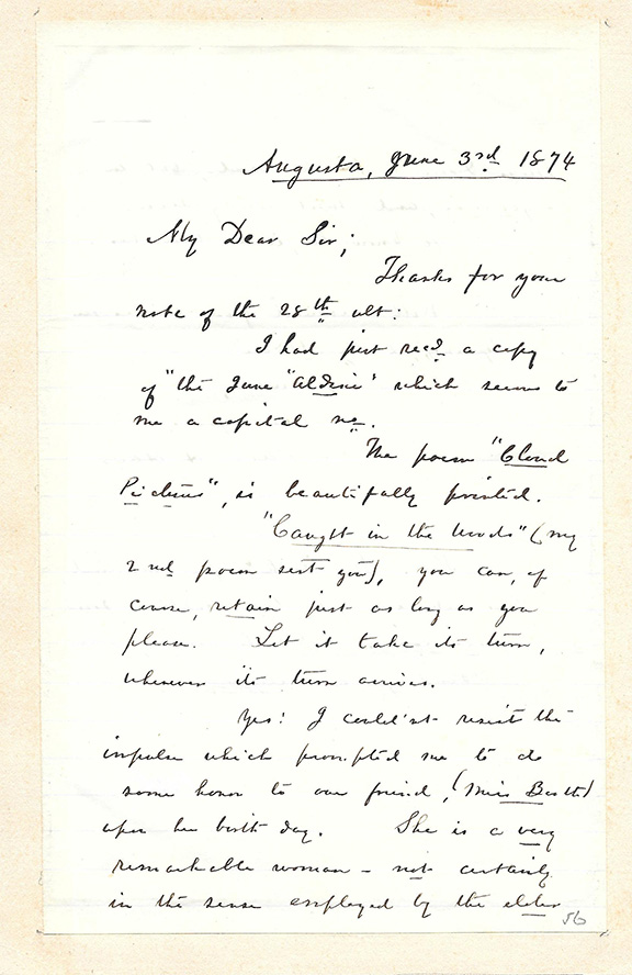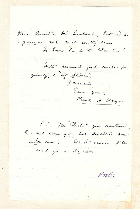 HAYNE, Paul H. (1830-1886). South Carolina poet. Served in the Confederate Army in 1861. He lost all his possessions, his home and major library when Charleston was bombarded in 1962, Co-founder of Russell’s Magazine. Known throughout country as the Poet Laureate of the Confederacy. Uncommon autograph letter signed, 2 pages, Augusta, 6/3/1874. In part: “The poem Cloud Pictures is beautifully printed. “Caught In The Woods” my second poem sent you, you can of course retain just as long as you please. Let it takes its turn whenever its turn arrives. Yes I couldn’t resist the impulse which prompted me to do some honor to our friend...upon her birthday. She is a very remarkable woman...to know her is to like her...” Signed in full. A four line P.S. states: “The check you mentioned has not come yet...on its arrival, I’ll send you a receipt.” Tipped to a larger sheet. A fine desirable letter..................................... $650.00