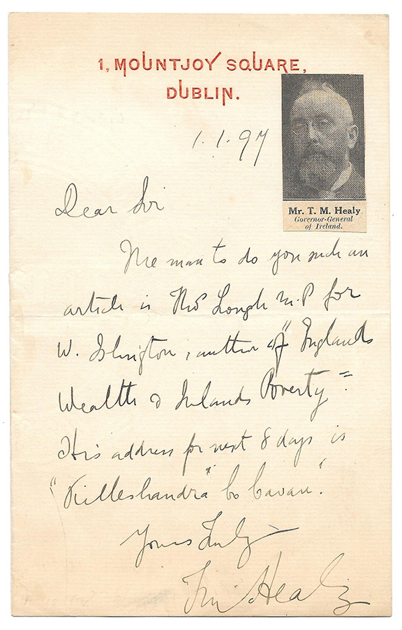 HEALY, Timothy Michael (1855-1931). Irish Nationalist, leader, First Governor General of the Irish Free State (1922-1927). Author. Scarce early autograph letter signed, one page, Dublin, 1/1/97. He states where the author of “England’s Wealth and Ireland’s Poverty” can be located for the next eight days. Small newspaper portrait affixed to the upper right corner of the letter........................ $150.00