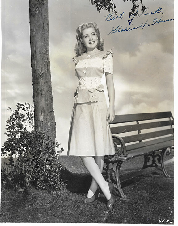 DE HAVEN, Gloria (1925-2016). American actress known for Two Girls and A Sailor (1944). Beautiful photograph, B&W, 7.5”X9”, full length pose looking simply beautiful. Two-word sentiment signed: “Best of Luck Gloria DeHaven.” Light mounting traces on the corners of verso otherwise in fine condition.........$55.00
