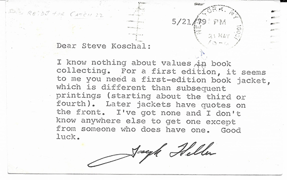 Author of Catch 22 HELLER, Joseph (1923-1999). American author, best known for “Catch 22.” T.L.S. on a postcard dated 5/21/79. He types; “I know nothing about values in book collecting. For a first edition, it seems to me you need a first-edition book jacket, which is different than subsequent printings (starting about the third or fourth). Later jackets have quotes on the front. I’ve got none and I don’t know anywhere else to get one except from someone who does have one. Good luck.” Signed in full. Heller is responding to a request for help in obtaining a first edition dust jacket for “Catch 22.”.........................$85.00