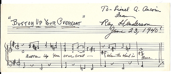 HENDERSON, Ray (1896-1970). Noted composer best known for his songs “I’m Sitting On Top Of The World”, “Life Is A Bowl Of Cherries”, “Five Foot Two And Eyes Of Blue”, Bye, Bye Blackbird” and “Button Up Your Overcoat“ written by Henderson and Irving Berlin in 1928. AMuQs, Henderson has penned two line of music and the words to “Button Up Your Overcoat” on printed music paper measuring 3.5”x9". Inscribed signed and dated “June 23, 1940”. Perfect!...............................$325.00