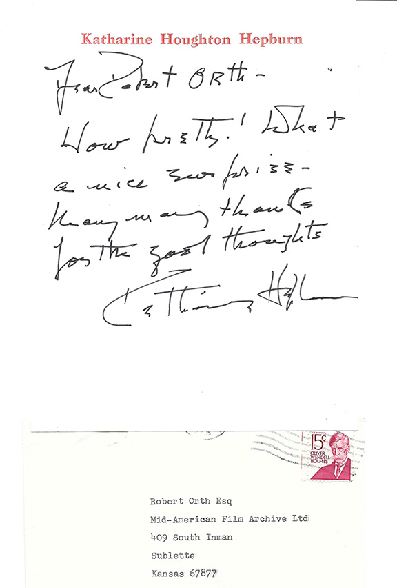 Extremely rare autograph letter signed with her full name. Very few handwritten letters have come on the market signed in full. Autograph letter signed, one full page on her name imprinted letterhead. “Dear Robert Orth (President of Mid-American Film Archive Ltd). “How pretty! What a nice surprise- Many, many thanks for the good thoughts, Katharine Hepburn”. This letter is in response to a birthday gift of flowers. In 1921, Katharine discovered her older brother dead, hanging from the ceiling of his room. For quite some time she adopted Tom’s birthday, November 8, as her own. Original envelope comes with her A.L.S. postmarked Nov. 9, 1979........$475.00