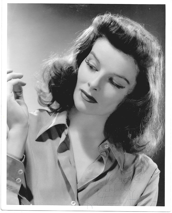 On the verso several lines “Katharine Hepburn Returns To Hollywood From Broadway” and discusses her part in the Philadelphia Story. A young and radiant looking Hepburn inscribes and signs this photograph with her full signature. “To Vernon, gratefully Katharine Hepburn.” Vernon Hanson worked in the commissary at the studio. Most movie stars would take their break after filming. In V/G- Fine condition except for three minor mounting traces on the verso. Hepburn’s writing darker than on this illustration, easily read. .....................$750.00