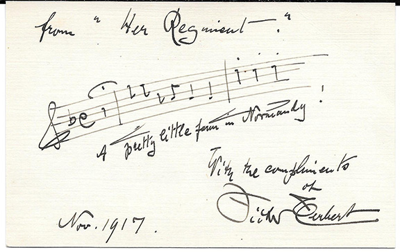 HERBERT, Victor (1859-1924). Irish-American composer of light music; master of the musical. He was a conductor and also organized and conducted his own orchestra. He composed several highly successful operettas and two grand operas. He wrote musical scores for the Ziegfeld Follies. Delightful autograph musical quotation signed from Her Regiment. Dated, Nov. 1917. At the top of the card, Herbert has penned three bars from the work which he has also identified. He has also written the words from the song below the bars. “A pretty little farm in Normandy!” Highly attractive musical card in excellent condition. Bars of music from this work by Herbert are rather uncommon ............................$550.00