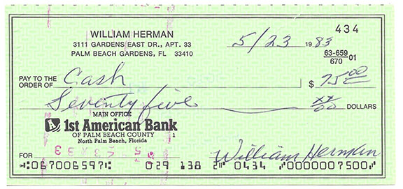 HERMAN, Billy (1909-1992). American professional baseball player and manager during the 30’s and 40’s. Inducted into the Baseball Hall of Fame in 1975. His personal check, accomplished in his hand and dated 5/23/83 and made payable to “Cash” for $75.00. Boldly signed “William Herman” and endorsed by him on the verso. One small tear near the date otherwise a very good example...........$87.50 |
