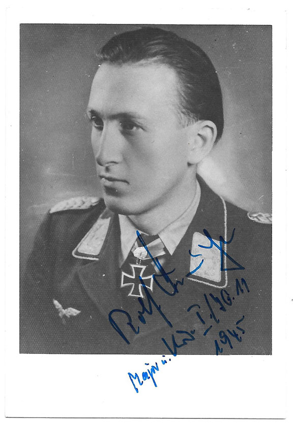 HERMICHEN, Rolf (1918-2014). German fighter pilot during WWII. Ace credited with 64 victories, including 26 four engine strategic bombers. Awarded the Knight’s Cross of the Iron Cross with Oak Leaves. Photograph, 3.5”x5”, B&W of Hermichen in uniform, head & shoulders pose. Signed with a full signature and he adds his rank and assignment, dating this 1945. Nice contrast................... $75.00 |