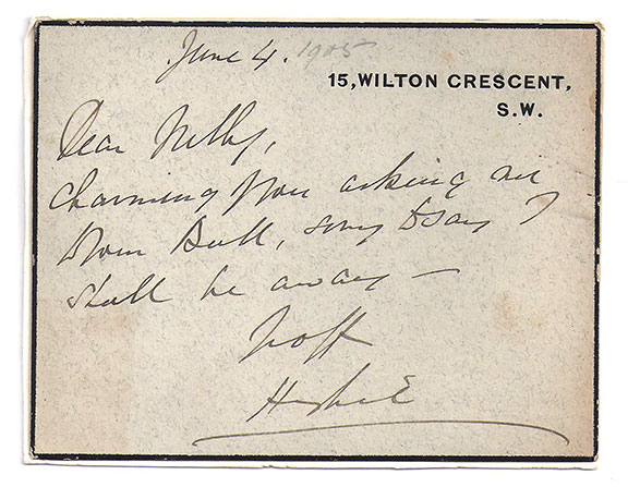 HERSCHEL, Sir William James (1838-1917). Discoverer of the use of fingerprints. He proved their individuality. He initiated the modern system if identification in Bengal (1878). Scarce autograph note signed, one page on a large card with his imprinted address. June 4, (1905). Appreciates an invitation but says he will be away. A fine and desirable example............................... $495.00