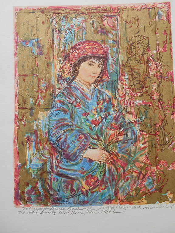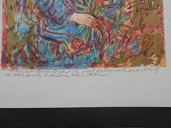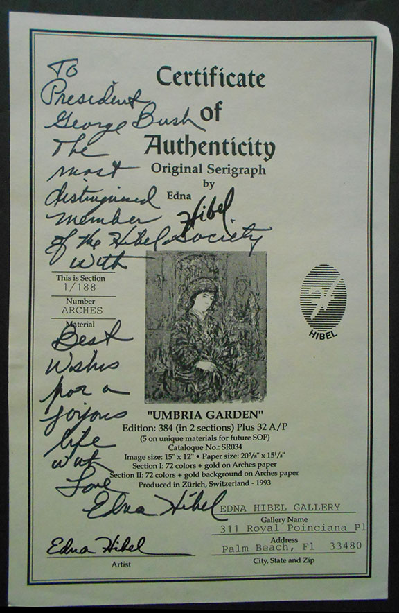 HIBEL, Edna (1919-2014). American painter known for her impressionistic landscapes and Mother of Children series. Inspired by Mary Cassatt and Renoir. In 1940 she was the youngest artist at the time honored by a major American museum. Her works have been exhibited in prestigious museums, galleries and palaces around the world. Beautiful colorful original serigraph, measures appx. 15’’X20.’’ Title “Umbria Garden” copy #1 of 188 copies. Signed “Hibel” in pencil on the lower right portion on the serigraph. On the lower white margin written in pencil: “To President George Bush – The most distinguished member of the Hibel Society. With Love Edna Hibel.” Together with a Certificate of Authenticity from the Hibel Society. Edna Hibel has inscribed the certificate in ink: “To President George Bush the most distinguished member of the Hibel Society with Best Wishes for a joyous life with Love Edna Hibel.” This serigraph was produced in 1993 the last year of Bush’s presidency. Both items in mint condition.....................$695.00