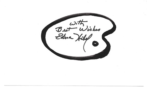HIBEL, Edna (1919-2014). American painter known for her impressionistic landscapes and Mother of Children series. Inspired by Mary Cassatt and Renior. In 1940 she was the youngest artist at the time honored by a major American museum. Her works have been exhibited in prestigious museums, galleries and palaces around the world. Original sketch of a palate. Inside the palate she writes: “With Best Wishes Edna Hibel” drawn on a 5”x8” blank card in her Florida studio