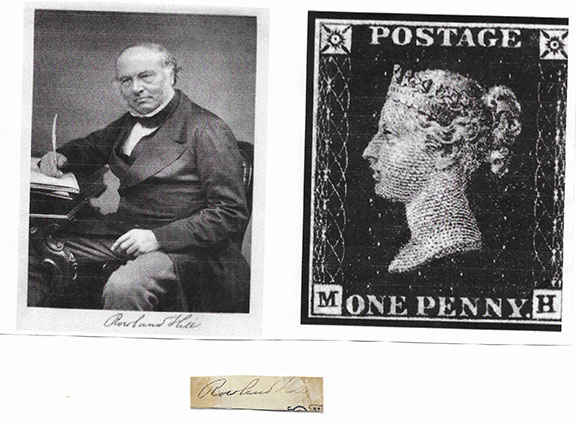 HILL, Sir Rowland (1795-1879). English teacher, social reformer and inventor. He found a solution for pre-payment and cheap transfer of letters. He is credited with the basic concept of the modern postal system including the invention of the postage stamp. The first stamp being the Penny Black in 1840. Ink signature on a small slip............$95.00 |