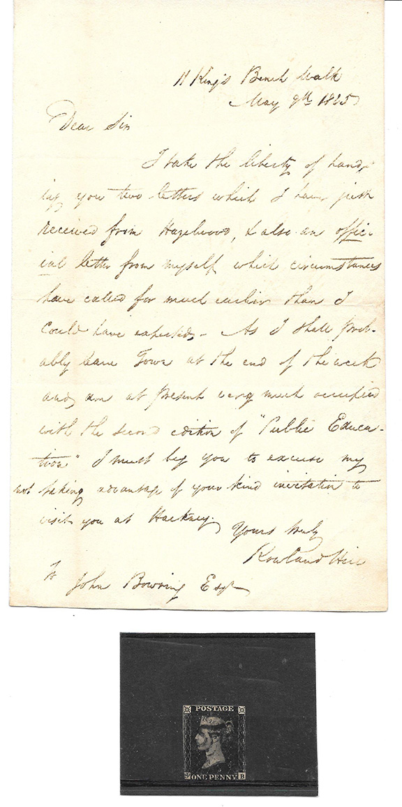 HILL, Sir Roland (1795-1879). English postal reformer, invented the concept of prepayent of postage through the use of postage labels (stamps). He originated the “Penny Postage” . He is buried in Westminster Abbey, Autograph letter signed, one page, May 9, 1825, 11 King’s Bench Walk. In part: “I take the liberty of handing you two letters which I have just received from Hazelwood and also an official letter from myself which circumstances have called for much earlier than I could have expected...and am at present very much occupied with the second edition of ‘Public Education’. I must beg you to excuse my not taking advantage of your kind invitation to visit you...” Signed in full. Together with an original Penny Postage Stamp created by Hill. Interestingly this stamp also has the first cancellation used (Maltese Cross) thus a very early postally used example. Fine......... $895.00