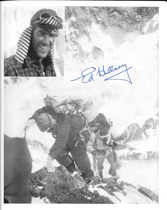 HILLARY, Sir Edmund (1919-2008). New Zealand mountaineer, explorer. Member of the first party to reach the summit of Mt. Everest on May 29, 1953. News of the success of the expedition reached London on the morning of Queen Elizabeth II Coronation. Choice, photo, 8”x10”, B&W of Hillary and his Sherpa guide about to reach the top of Mt. Everest. Fine insert full face of a smiling Hillary at top left corner of the photo. Boldly signed “Ed Hillary” with excellent contrast. From a private signing in 2001.................$150.00