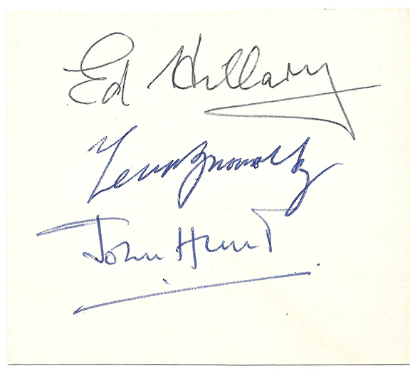HILLARY, Sir Edmund (1919-2008). New Zealand mountaineer, explorer. NORGAY, Tenzing (1914-1986). Sherpa Guide HUNT, John (1910-1998). Leader of the Expedition to Mt. Everest. Hillary and Norgay were part of the British expedition to the top of Mount Everest lead by Brigadier, Baron J. Hunt. Tenzing Norgay was the most prominent member of the first party to reach the summit of Mount Everest on May 29, 1953. News of the success of the expedition reached London on the morning of Queen Elizabeth II Coronation. Card measuring 3.5”x3” hand signed in ink by “Ed Hillary”, a rare full signature of “Tenzing Norgay” and by “John Hunt”. Quite uncommon to find all three on the same item. In mint condition................SOLD ![]() |