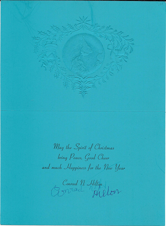 HILTON, Conrad (1887-1978). American businessman, founder of the Hotel Chain that bears his name. His personal Holiday Greeting Card which contains a printed Holiday sentiment and his name in print. Conrad Hilton, in old age, has signed his name beneath his printed signature. Hilton’s signature is not common in any form. He had a little difficulty with his pen writing his first name and middle initial but easily readable. Most unusual.................... $95.00