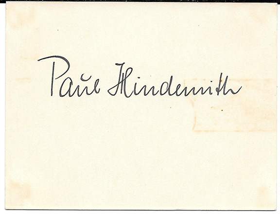 Hindemith, Paul (1895-1963). German composer, violinist and conductor. Some condemned his music because of his relationship with the Nazi’s and also his sexually charged operas. Later, Joseph Goebbels publicly denounced Hindemith. Hindemith is among the most significant German composers of his time. A fabulous, dark, bold, black ink signature on a large card..............................................$125.00![]() |