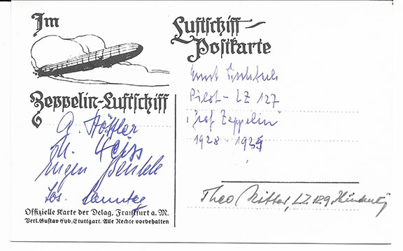HEISS, Norbert. Electrical officer Graf Zeppelin (LZ 127) BENTELE, Eugene. Head mechanical officer Hindenburg/Graf Zeppelin (LZ 127) (LZ 129) SONNTAG, Josef. Electrical officer Graf Zeppelin (LZ 127) FISCHBACK, Ernst. Pilot LZ127 Graf Zeppelin (1912-1935) (LZ 127) RITTER, Theo. Machine officer Hindenburg (LZ 129) Wonderful postcard of the Graf Zeppelin, with at least two dozen men holding her down on the ground. printed in German. Signed in ink of the six officers named above. Ernst Fischback has added under his signature: “Pilot- LZ-127, Graf Zeppelin, 1928-1935.” In excellent condition. ................$275.00 ![]() ![]() |