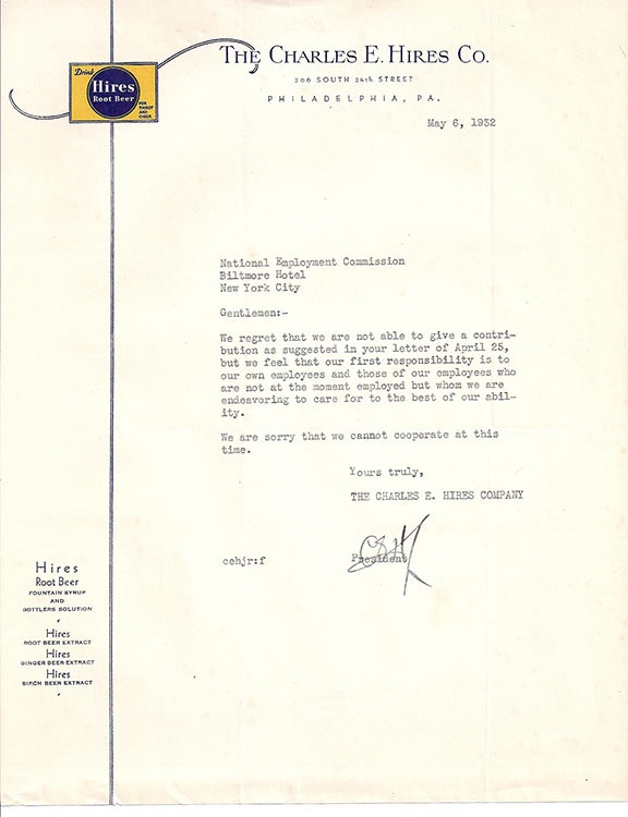 SHIRES, Charles E. (1851-1937). A Quaker pharmacist who in the 1870’s formulated the Hires Root Beer beverage. He learned about a similar beverage on his honeymoon in New Jersey. The woman who ran the hotel served a “root tea”. At the 1876 U.S. Centennial Exposition held in Philadelphia he called his drink “The Temperance Drink” the greatest health beverage in the world. He owned sugar plantations in Cuba. Today, Hires Root Beer is manufactured and marketed by Dr. Pepper Snapple Group. Typed letter signed on his ornate name imprinted letterhead displaying the colorful “Drink Hires Root Beer” logo. Philadelphia, May 6, 1932 to the National Employment Commission at the Biltmore Hotel in NYC. Charles Hires writes that they can’t give a contribution as they feel their first responsibility is to our own employees and those of our employees who are not at the moment employed but whom we are endeavoring to care for to the best of our ability. For decades, signatures of Charles Hires have been rare in any form. In very good condition............. $295.00
