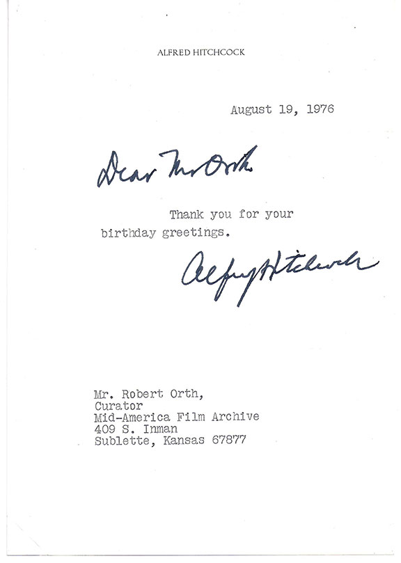HITCHCOCK, Alfred (1899-1980). British film director, best known for his suspense filled horror films. Remembered for his profile and voice. He directed more than 50 films in as many years. In the 50’s and 60’s he produced and hosted two television mystery series. Typed letter signed on his name imprinted stationery. Dated, Aug. 19, 1976. He writes: “Dear Mr. Orth, thank you for your birthday greetings”. Hitchcock has signed with a fabulous bold signature adding “Dear Mr. Orth” in his hand. Orth was Curator of Mid-American Film Archives. Letters of Hitchcock are considered quite uncommon..............................SOLD