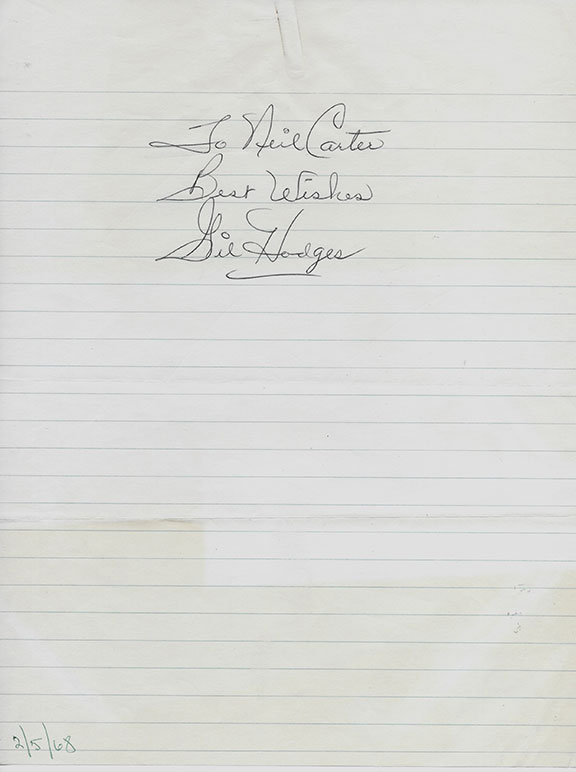 HODGES, GIL (1924-1972) American first baseman and manager in Major League Baseball played most of his 18 year career with the Brooklyn/Los Angeles Dodgers. Inducted into the Baseball Hall of Fame (2021) Fabulous large signature inscribed with a two word sentiment on a full sheet of lined paper. Date in an unknown hand at the very bottom of the page “2/5/68.” As fine a signature as one can imagine...................$1200.00![]() |