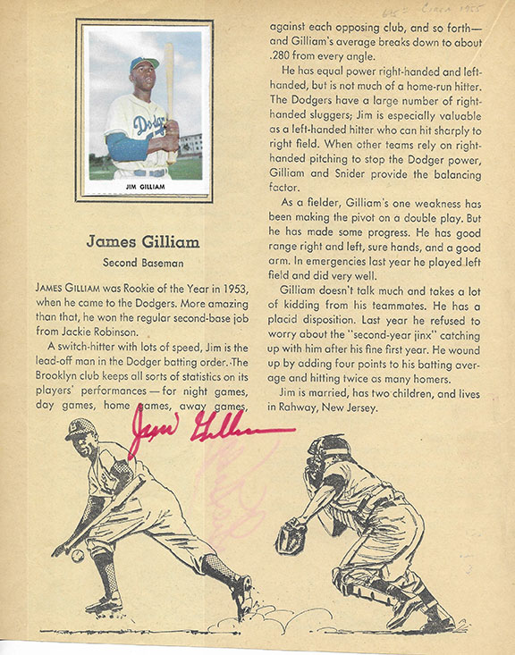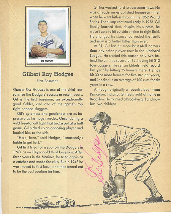 HODGES, GIL (1924-1972) American first baseman and manager in Major League Baseball played most of his 18-year career with the Brooklyn/Los Angeles Dodgers. Inducted into the Baseball Hall of Fame (2021) Fabulous large signature in red ink on a page which contains his biography. On the verso is the same type biography of James Gilliam which is also signed. In very good condition....................$595.00![]() ![]() |