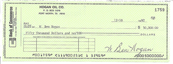 HOGAN, Ben (1912-1997). American professional golfer. He is considered one of the greatest players of the game. He won 9 career professional championships. His check on the imprinted Hogan Oil Co. Ft. Worth, TX. Dec. 10, 1992 made payable to W.B. Hogan for $50,000.00. Hand signed “W. Ben Hogan.” A few folds otherwise in fine condition...............................$149.00 |