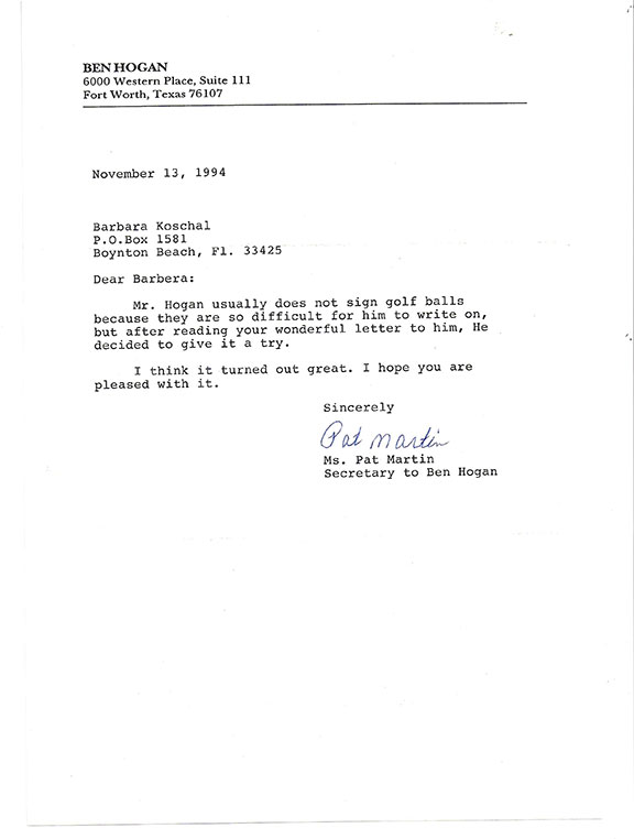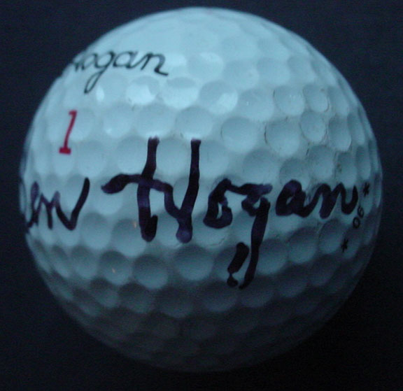 Ben Hogan golf ball signed. Together with a typed letter signed by his secretary, on his letterhead, November 13, 1994. The secretary writes: “Mr. Hogan usually does not sign golf balls because they are so difficult for him to write on, but after reading your wonderful letter to him, he decided to give it a try. I think it turned out great. I hope you are pleased with it.” It seems obvious from the content of this letter that there are not many genuine signed golf balls by Ben Hogan in the market.................SOLD