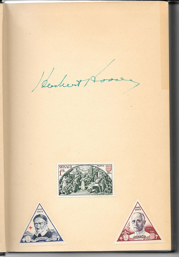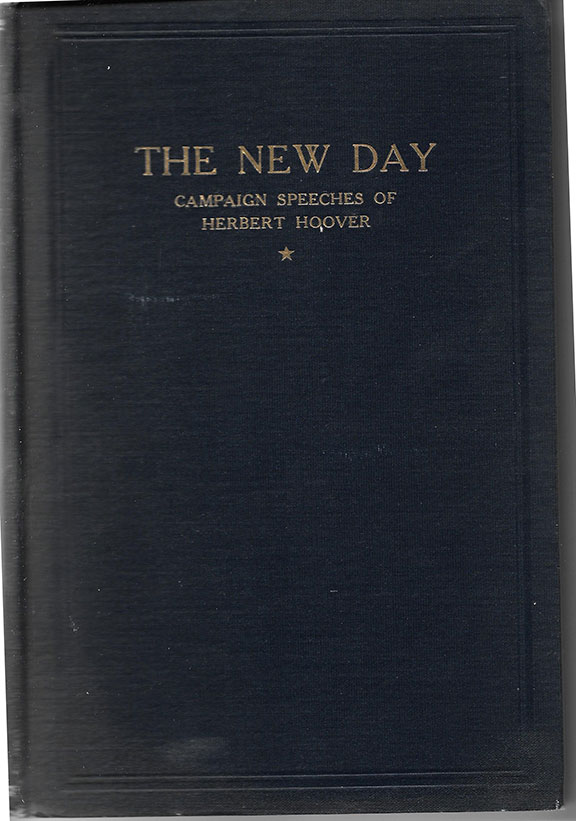 HOOVER, Herbert (1874-1964) Thirty-first President of the United States. His book: “The New Day, Campaign Speeches of Herbert Hoover.” Stanford University Press, Second Edition, January 1929. Two hundred and thirty pages. Signed “Herbert Hoover” on the front free endpaper. This is the first book we recall seeing not inscribed by Herbert Hoover. The colorful stamps from Morocco affixed to the bottom of the page Hoover signed. In near fine condition................$450.00
