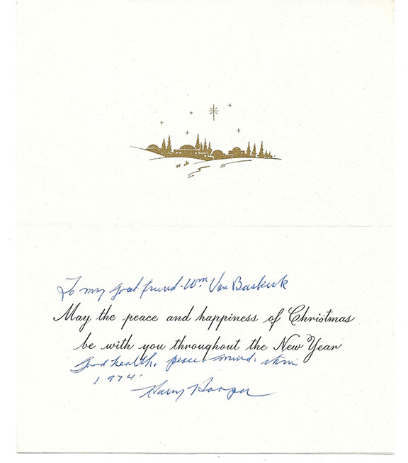 HOOPER, Harry (1887-1974). Outfielder for the Red Sox. Elected to the Baseball Hall of Fame (1971). First player to hit two home runs in a World Series game. His Christmas Card which contains a fine lengthy inscription to a friend: “To my good friend Wm. Van Baskirk, good health, peace of mind to him 1974, Harry Hooper.”..............$85.00![]() |